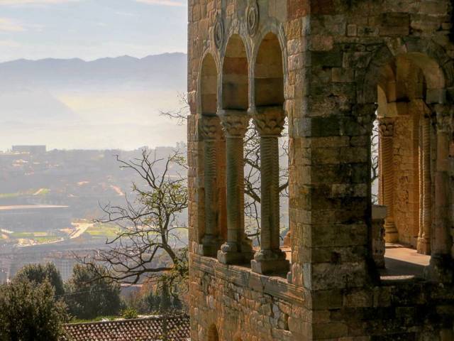 View of Oviedo from the Palacio de Santa Maria del Naranco. This Asturian pre-Romanesque Palace was build in 842. The building that survived till today became later a church.